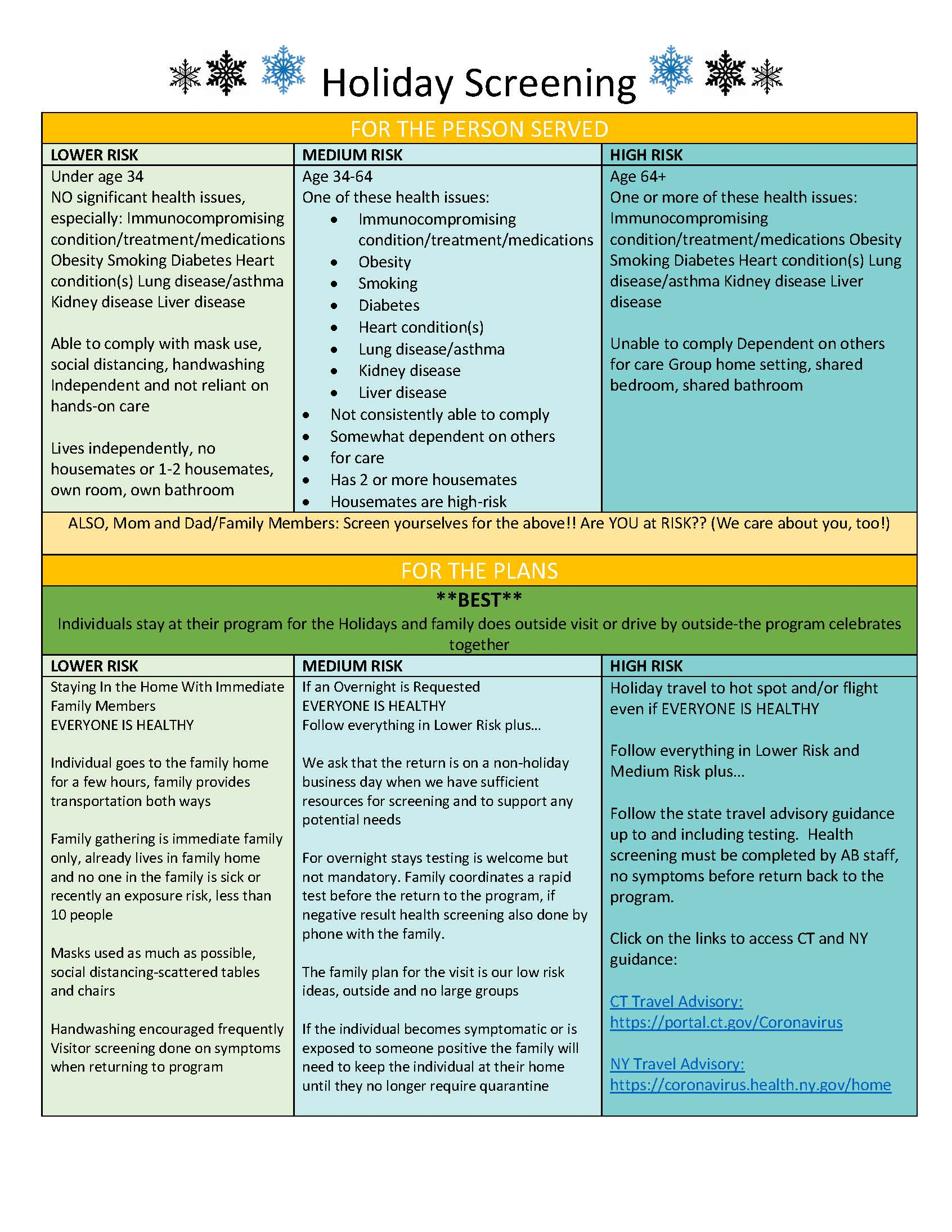 We would really prefer that individuals stay at their program for the Holidays and family does outside visit or drive by. Program celebrates together. If this is not possible, this tool may help you choose which visit type is best for your loved one based on their vulnerability and the level if risk of each type of visit.